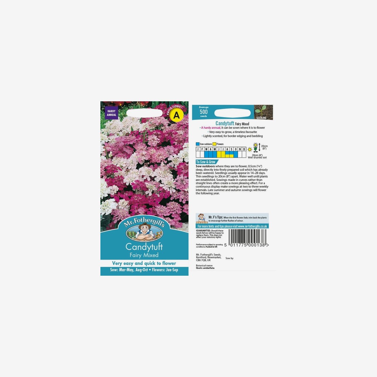 Fröpåsen innehåller cirka 500 fröer. Det latinska namnet är Iberis umbellata och plantorna blir cirka 20–25 cm höga.