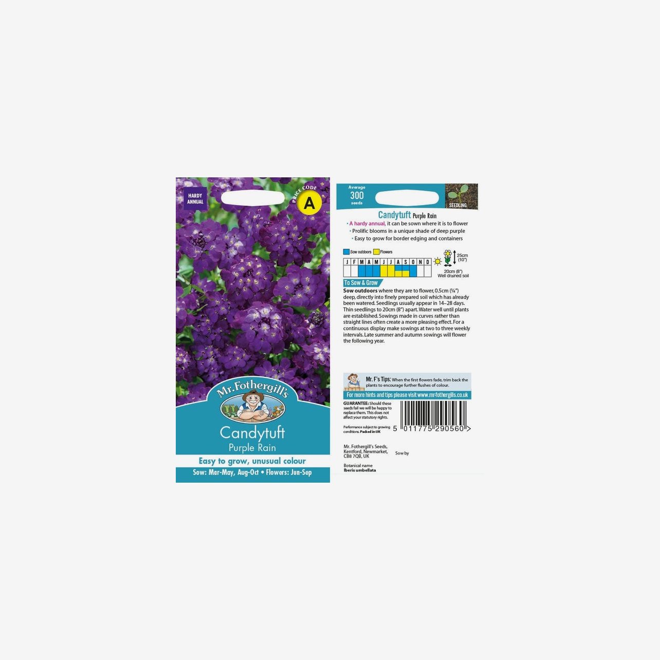 Fröpåsen innehåller cirka 300 fröer. Det latinska namnet är Iberis umbellata och plantorna blir cirka 20–30 cm höga.
