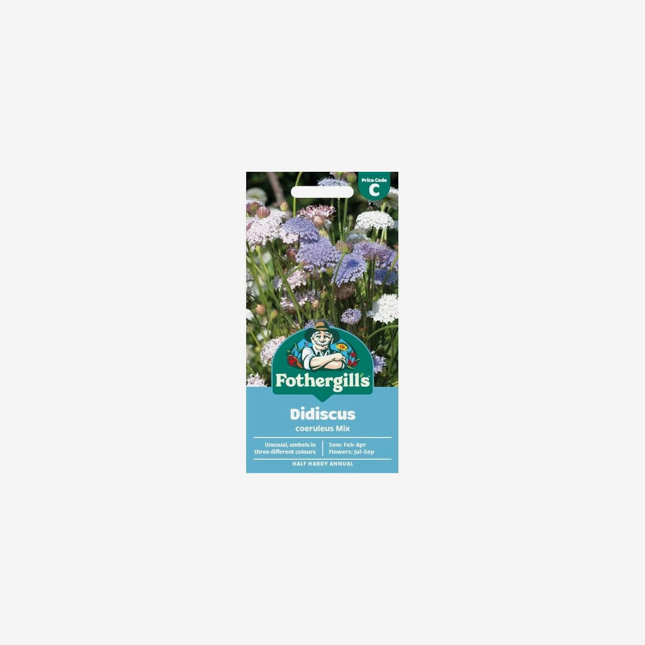 Fröpåsen innehåller cirka 100 fröer. Det latinska namnet är Didiscus caeruleus och plantorna blir cirka 60–70 cm höga.