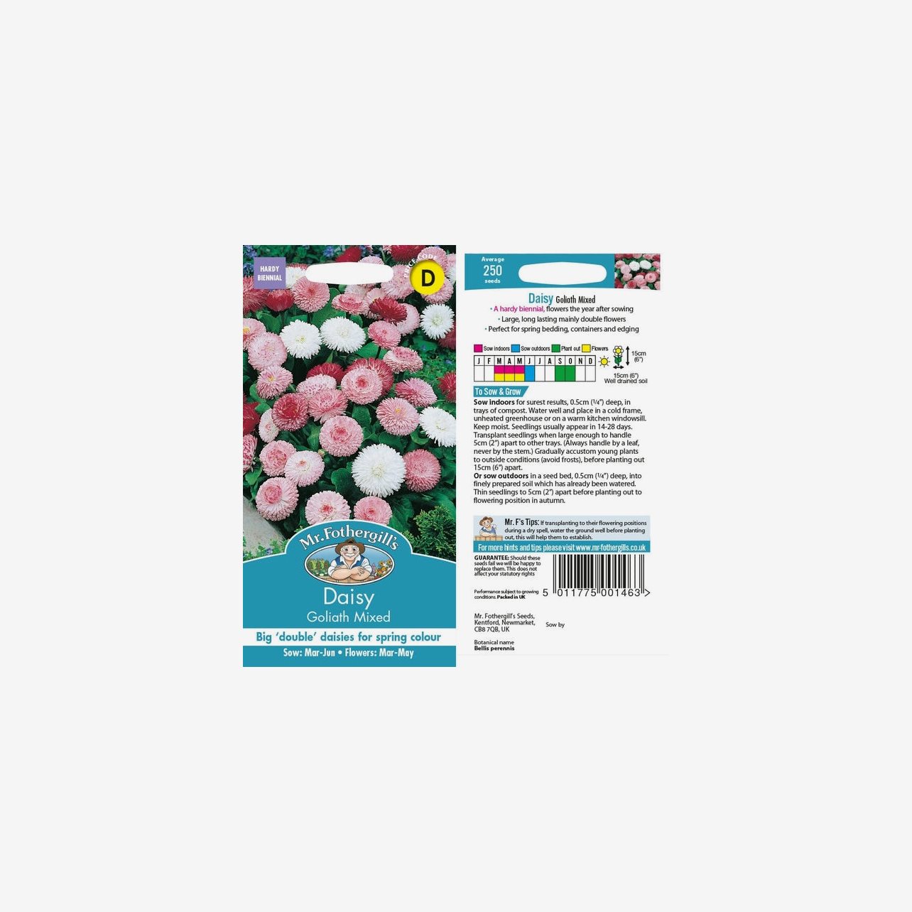 Fröpåsen innehåller cirka 200 fröer. Det latinska namnet är Bellis perennis och plantorna blir cirka 15–20 cm höga.