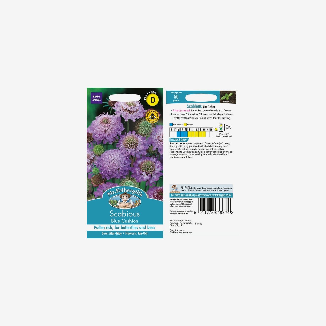 Fröpåsen innehåller cirka 75 fröer. Det latinska namnet är Scabiosa atropurpurea. Plantorna blir omkring 60 cm höga och har ett upprätt växtsätt. Blommorna är mellablå och mycket omtyckta av bin och fjärilar.