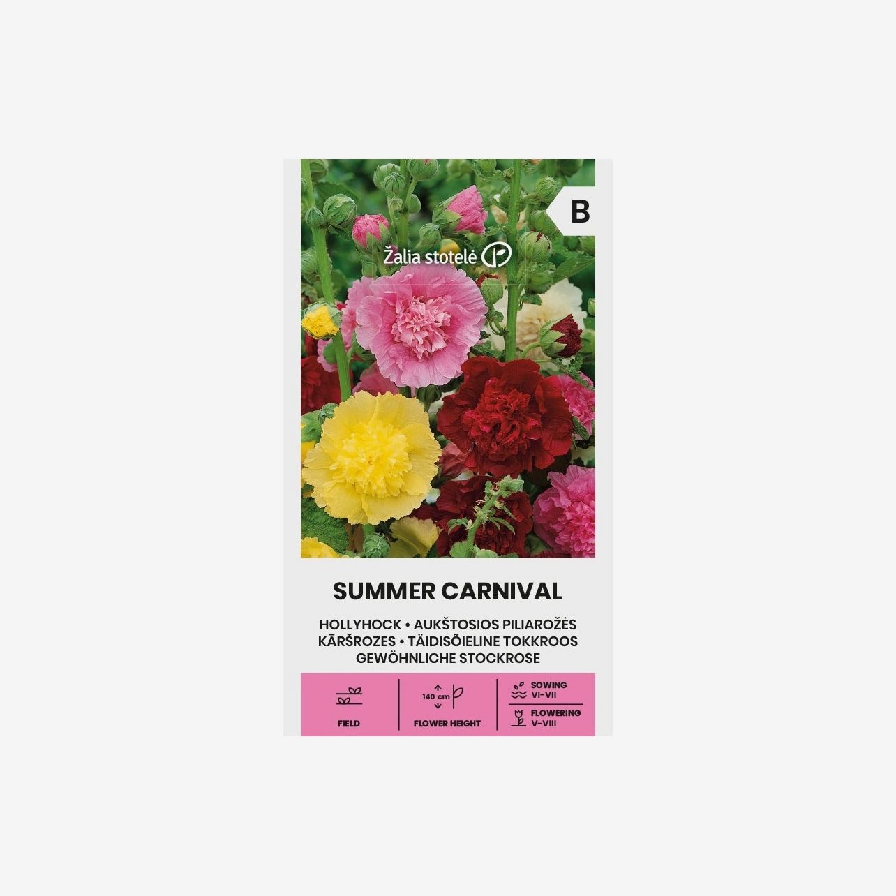 Stockros Summer Carnival är en praktfull tvåårig blomma med höga, stadiga stjälkar och stora, fyllda eller halvfyllda blommor i klara färger. Sorten passar utmärkt längs staket, väggar och husfasader där den ger höjd och färgprakt i trädgården.