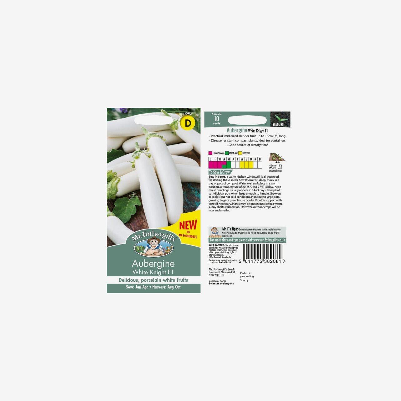 Fröpåsen innehåller cirka 10 fröer. Växtens latinska namn är Solanum melongena och den blir cirka 45 cm hög.