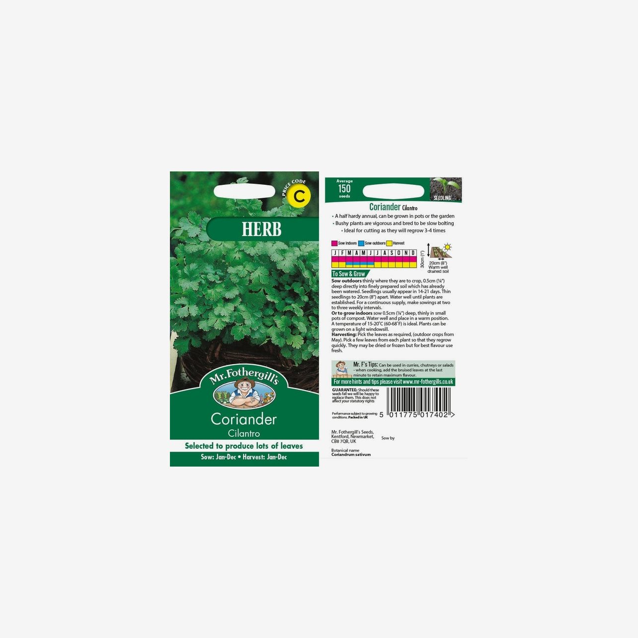Fröpåsen innehåller cirka 150 fröer. Det latinska namnet är Coriandrum sativum. Plantorna ger rikligt med breda, aromatiska blad med klassisk koriandersmak. Sorten lämpar sig både för odling utomhus och inomhus.
