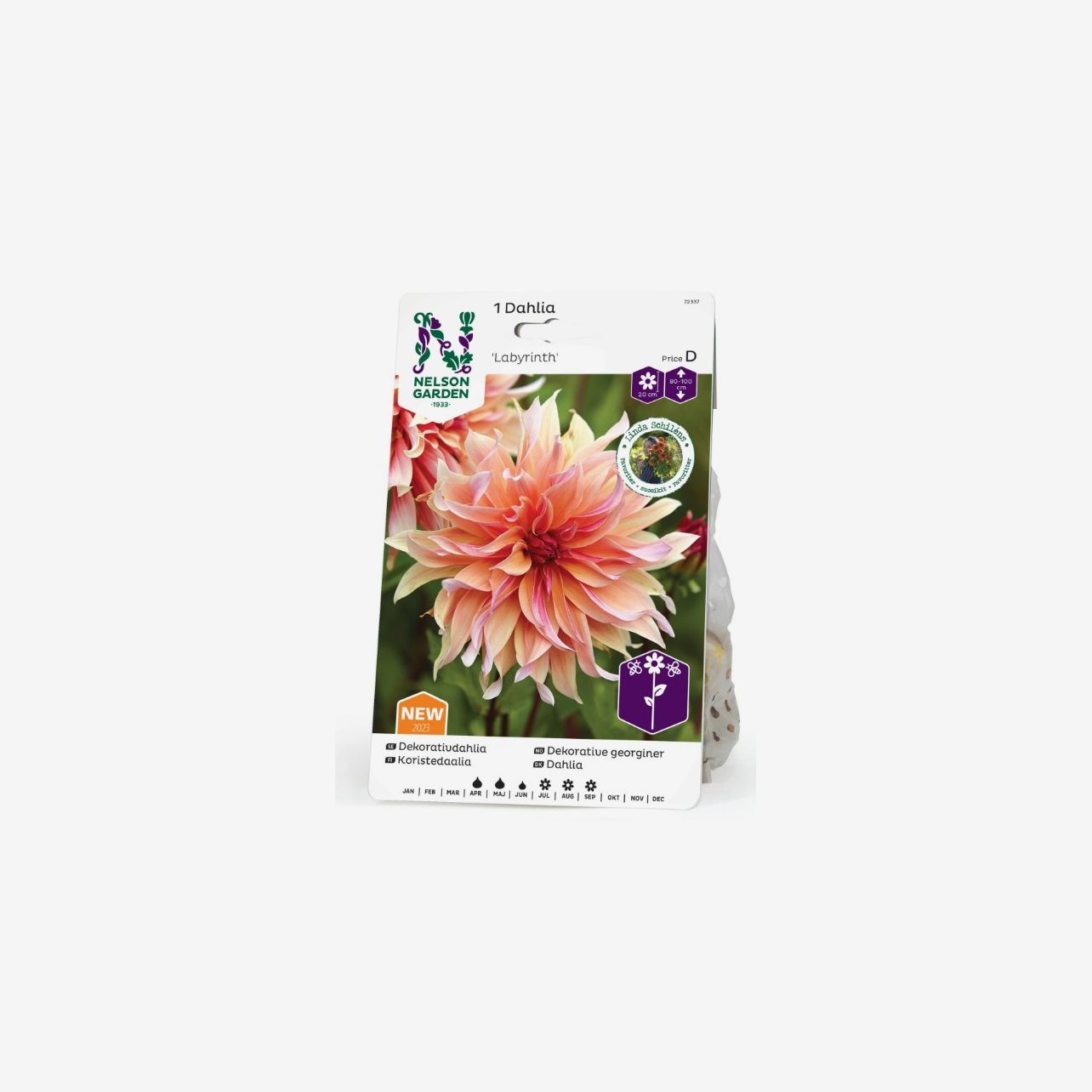 Den fina, dekorativa dahlian Labyrinth lämnar ett unikt intryck med sina vågiga, aprikosrosa blomblad. Med sina eleganta blommor, s.k dinnerplates, tar denna dekorativdahlia rabatten till nya höjder. Labyrinth passar utmärkt även som snittblomma.