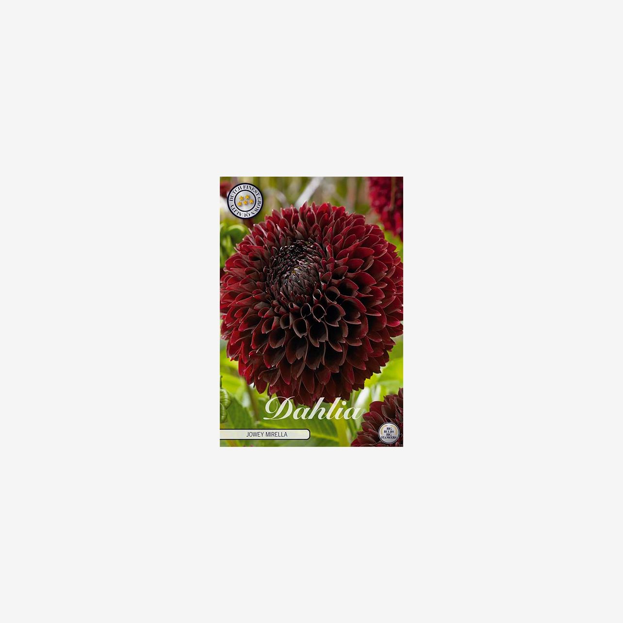 Dahlian Jowey Mirella blir ca 1 meter hög och får mörkt röda 9 cm stora blommor.