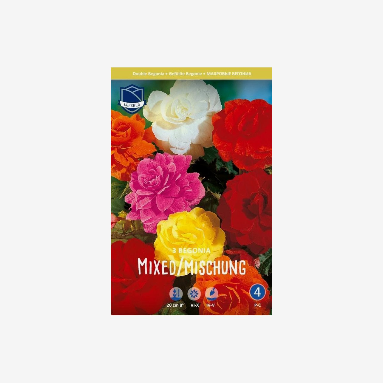 Denna förpackning innehåller 3 begoniaknölar i olika färger. Plantera tillsammans eller var för sig. Begonierna får dubbla blommor. Innehåller 3 lökar och blir ca 20 cm hög.