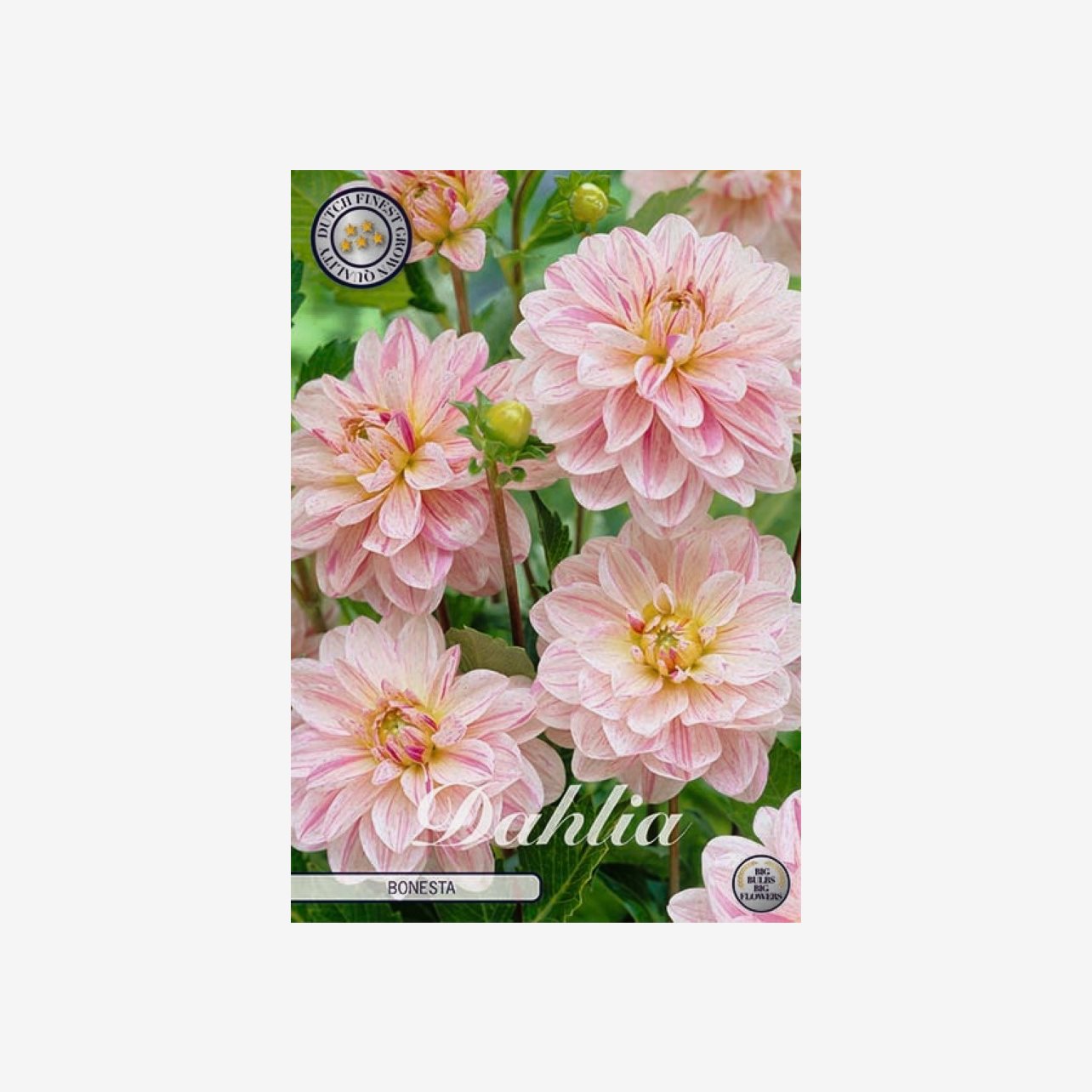 Bonesta är en högväxt näckrosdahlia med underbara rosa/vita blommor. Den är mycket bra som snittblomma.