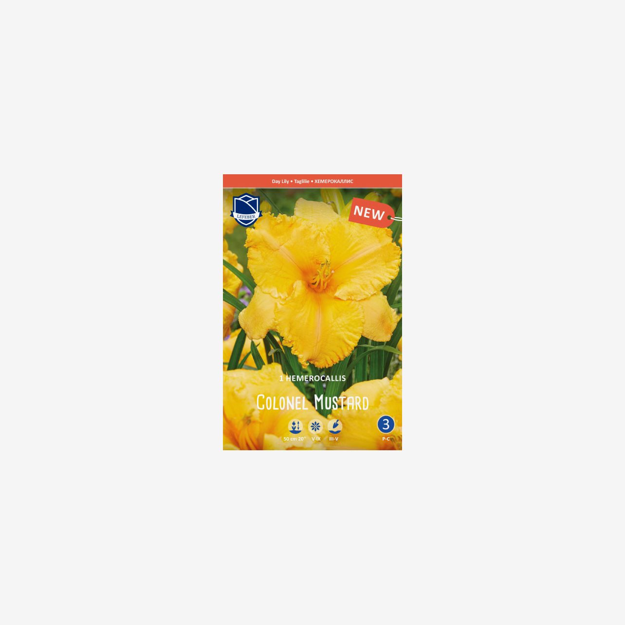 En förpackning innehåller 1 rotknöl till dagliljan Colonel Mustard.