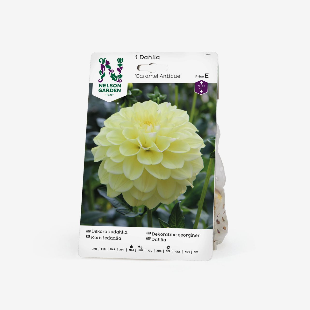 En förpackning innehåller 1 dahliaknöl till Caramel Antique.