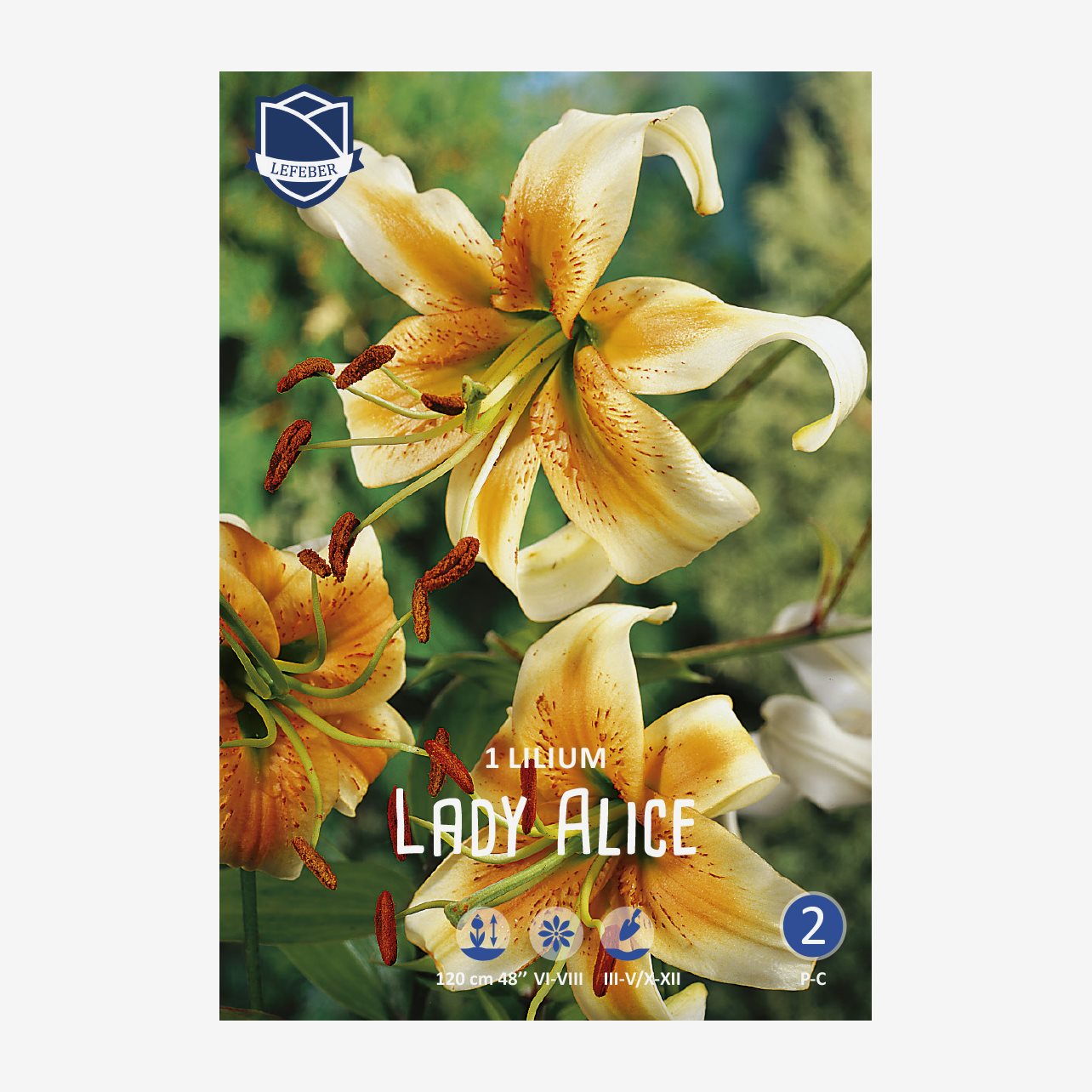 Denna lilja heter Lady Alice och blir ca 120 cm hög. Blommari i juli-september. En förpackning innehåller 1 lök storlek 20/22.