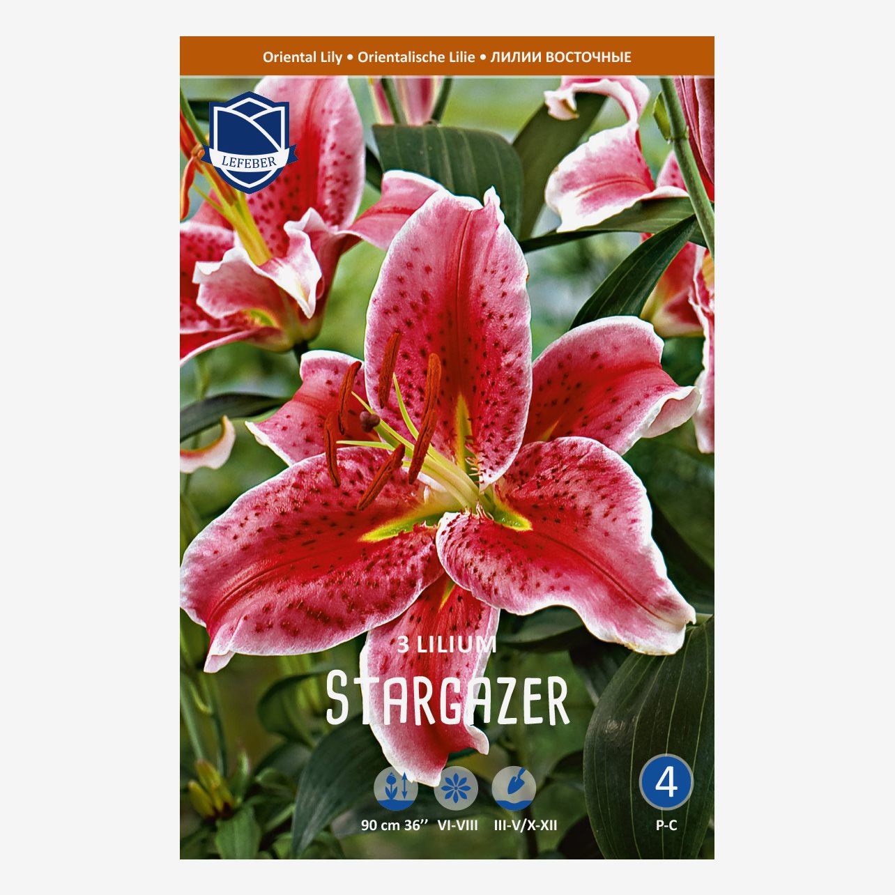 Denna orientlilja heter Stargazer och blir ca 90 cm hög. Blommar i juli-september. En förpackning innehåller 3 liljelökar storlek 16/18.