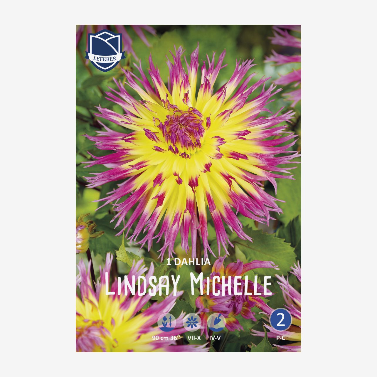 Denna kaktusdahlia heter Lindsay Michelle och blir ca 100 cm hög. En fp innehåller 1 dahliaknöl.