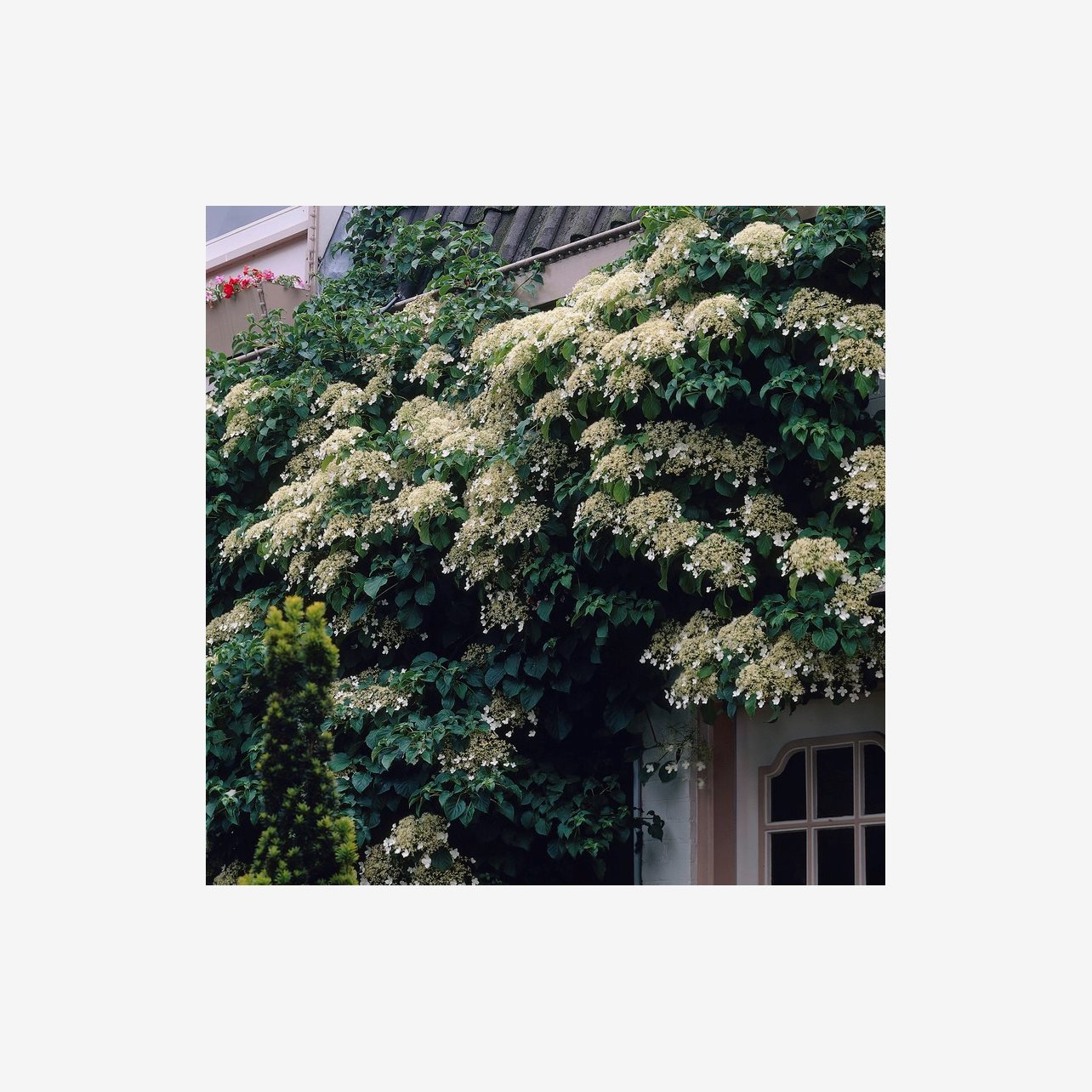 Klätterväxt med frodig grönska och vita, flata blomflockar. Skuggtålig. Dekorativ även i vinterträdgården med sin koppartonade bark.